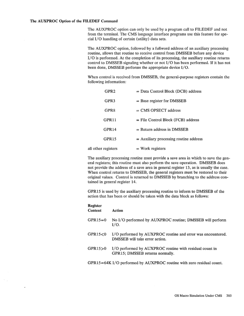 GPR15=64KI/O performed by AUXPROC routine with zero residual count. OS Macro Simulation Under eMS 385