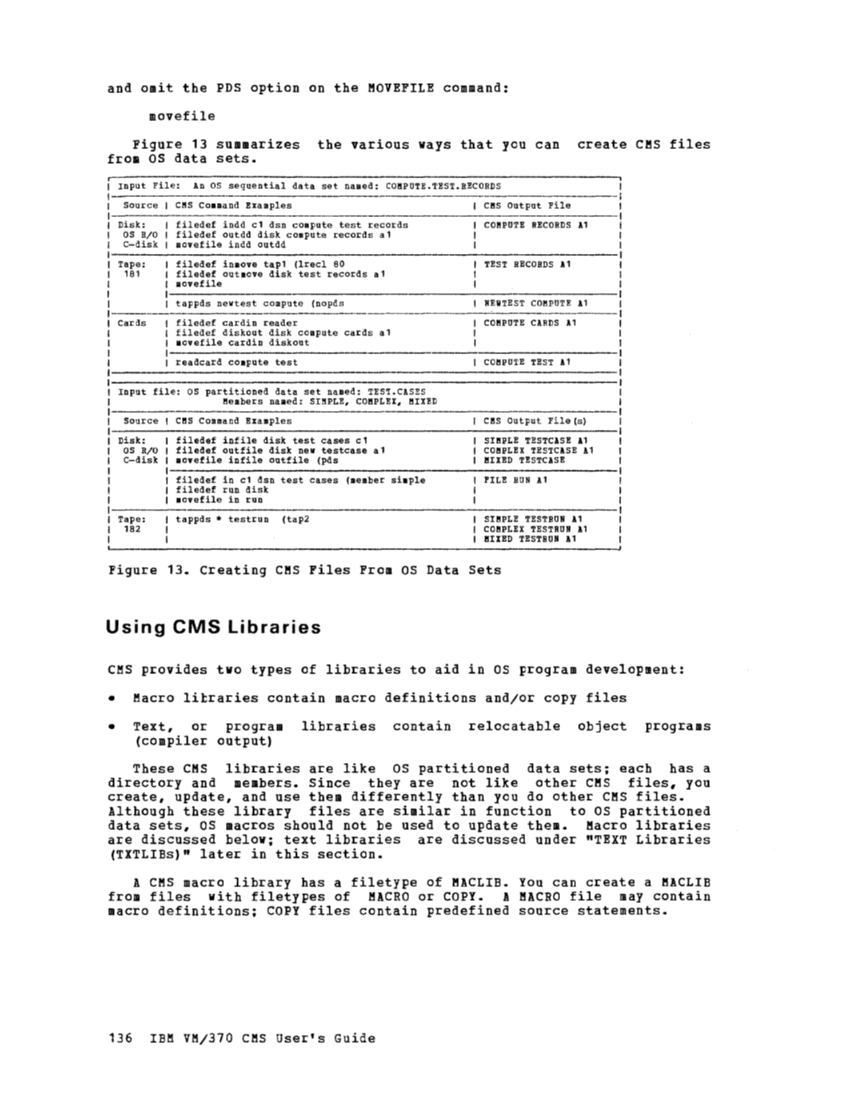 tappds * testrun (tap2CftS Output File COMPUTE RECORDS 11 TEST RECORDS 11 NEWTEST COMPUTE 11 COftPUTE CARDS 11 COMPUTE TEST 11 CMS Output File (5) SIMPLE TESTCISE 11 COMPLEX TESTCISE 11 !fIXED TESTCISE FILE RUN 11 SIMPLE TESTRUN 11 COMPLEX TESTRUN 11 MlIED TESTRUN 11 Figure 13. Creating CMS Files From OS Data Sets Using eMS Libraries CMS provides two types of libraries to aid in OS program development: • Macro litraries contain macro definitions and/or copy files • Text, or program libraries contain relocatable object programs