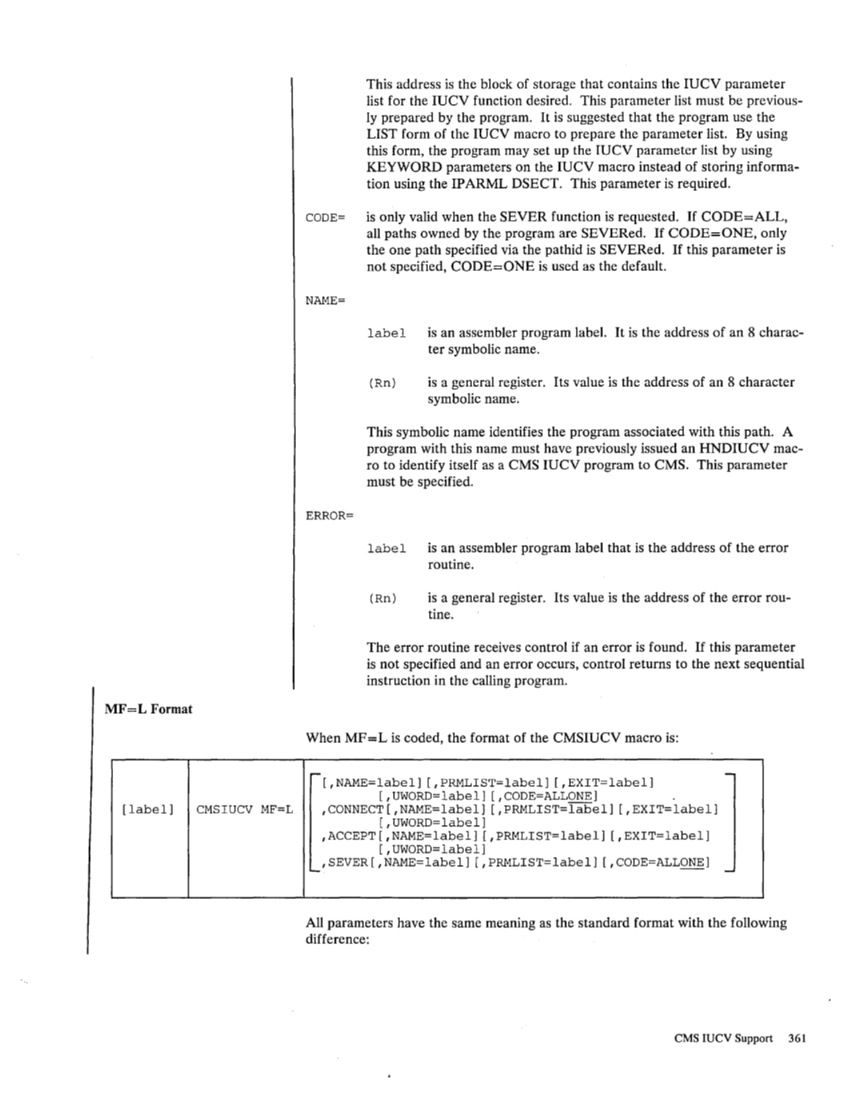 When MF=L is coded, the format of the CMSIUCV macro is:r- [,NAME=label] [,PRMLIST=label] [,EXIT=label]