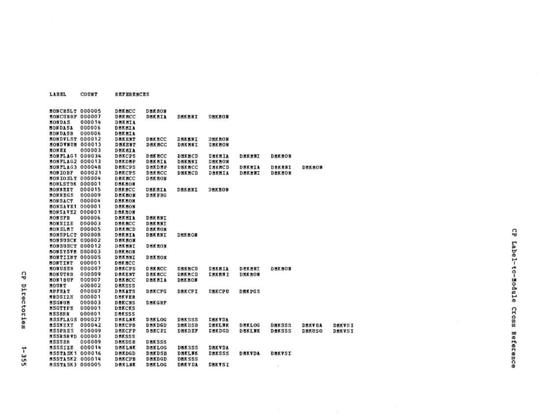 LABEL  COUNT   REFERENCES   ftONCRSLT   000005   DftKftCC   DftKMON   ftONCURBF   000001   DftKKCC   DKKftIA   DKKKNI   DftKftON   ftONDAS   000014   DKKKIA   ftONDASA   000006   DftKKIA   ftONDASB   000006   DKKKIA   ftONDVLST   000012   DftKENT   DftKKCC   DKKftNI   lOMKftON   ftOBDVRUK   000013   DftKENT   DftKKCC   DMKftNI   :CftKftON   KONEI   000003   DftKMIA   KONPLAGl   000034   DKKCPS   DMKMCC   DMKftCD   :CKKKIA   DftKKNI   DftKftOB   KONPLAG2   000013   DKKDftP   DftKftIA   DftKftNI   lDftKftON   ftONPLAG3   000048   DftKCPS   DMKDKP   DMKftCC   CKKftCD   DKKftIA   DKKftNI   DKKMON   KONIOBF   000021   DMKCPS   DMKMCC   DftKMCD   DKKMIA   D·KKMNI   DMKMON   MONIOSLT   000004   DMKMCC   DMKMON   MONLSTBK   000001   DftKMON   MONNEIT   000015   DMKKCC   DKKMIA   DMKMNI   DMKMON   MONREGS   000009   DMKftON   DMKPRG   MONSACT   000004   DMKftON   MONSAVEl   000001   DMKMON   MONSAVE2   000001   DMKMON   MONSFB   000006   DMKMIA   DMKftNI   lWNSIZE   000003   DMKMCC   DMKMNI   MON   SLft   T  000005   DMKMCD   DMKMON   n   MONSPLCT   000008   DMKMIA   DMKftNI   DMKMON   t'd   MONSUSCK   000002   DMKMON   t"'"   IWNSUSCT   000012   DMKMNI   DMKMON   ~   MORSYSVM   000003   DMKftON   t:f   MONTIINT   000005   DMKMNI   DMKMON   (1)   I-'   MONTINT   000001   DMKMCC   I   MONUSER   000001   DMKCPS   DMKftCC   DMKMCD   DKKftIA   DMKMNI   DMKftOH   M'   0   n   ftONUTRB   000009   DftKENT   DMKMCC   DKKPfCD   tMKMNI   DMKftON   I   t'd   ftON1BUF   000007   DftKftCC   DftKftIA   DMKMON   til:   t:::I   ftOUNT   000002   DMKSSS   0   PI   ....   MPPEAT   000007   DMKATS   DKKCFG   DMKCPI   DMKCPU   DMKPGS   d   H   PlRDSIZE   000001   DMKVER   I-'   (1)   (1)   n   MSGRUPI   000003   DftKCNS   DMKGRP   M'   ftSGTYPE   000001   DKKCKS   n   0   KSSERR   000001   DMKSSS   H   H   0   ....   MSSPLAGS   000021   DKKLNK   DMKLOG   DKKSSS   DftKVDA   Ul   (1)   ftSSNEXT   000042   DMKCPB   DftKDGD   DftKDSB   DftKLRK   DMKLOG   DftKSSS   DMKVDA   DMKVSI   Ul   Ul   PlSSPRES   000009   DMKCFP   DMKCPI   DftKDEP   DKKDGD   DKKLRK   DKKSSS   DMKUSO   DMKVSI   I:d   MSSRSRVD   000003   DKKSSS   (1)   MSSSER   000009   DMKDSB   DKKSSS   I-h   ...   PlSSSIZE   000014   DPlKLNK   DKKLOG   DftKSSS   DKKVDA   (1)   H   I   PlSSTASKl   000016   DKKDGD   DKKDSB   DKKLRK   DKKSSS   DKKVDA   DftKVSI   (1)   w   PlSSTASK2   000014   DMKCPB   DKKDGD   DMKSSS   =   U'1   n   U1   K   SSTA   SK3   000005   DKKLNK   DMKLOG   DftKVDA   DftKVSI   (1)